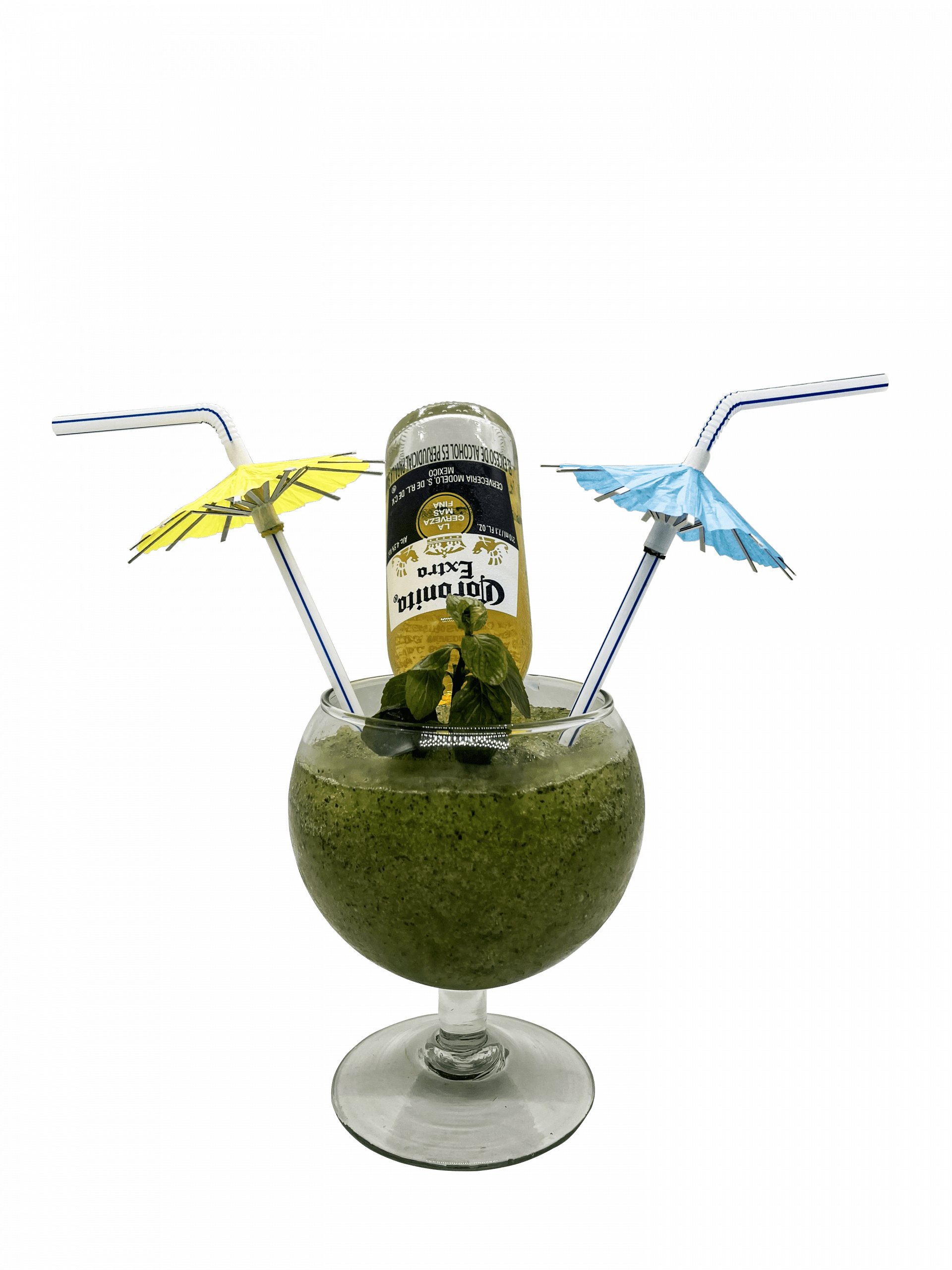 Tequila, triplesec, limón, blue curacao y cerveza Corona.