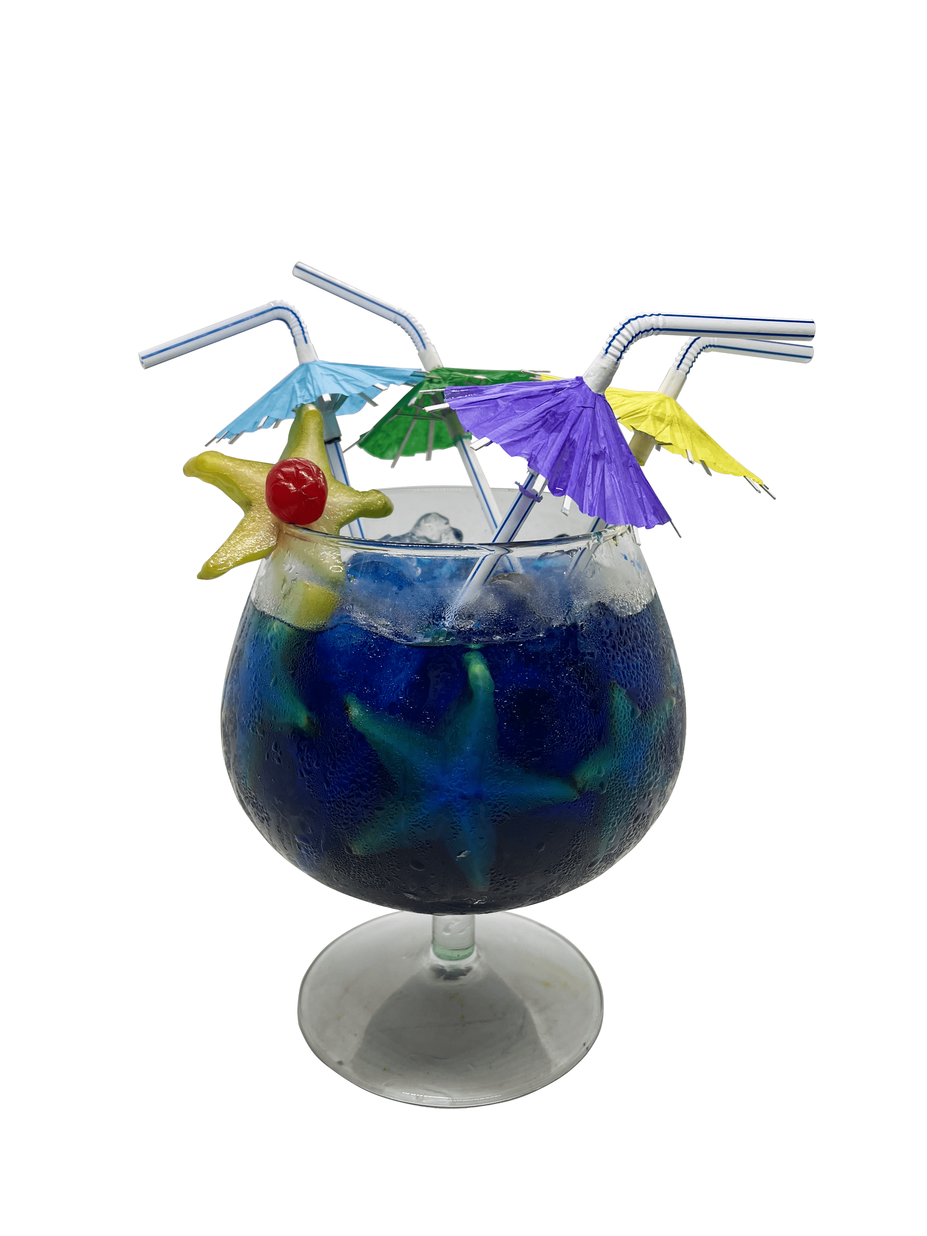 Tequila, Ron Bacardi, Vodka, Ginebra, Licor de Durazno, Blue Curacao, limón y sirope.