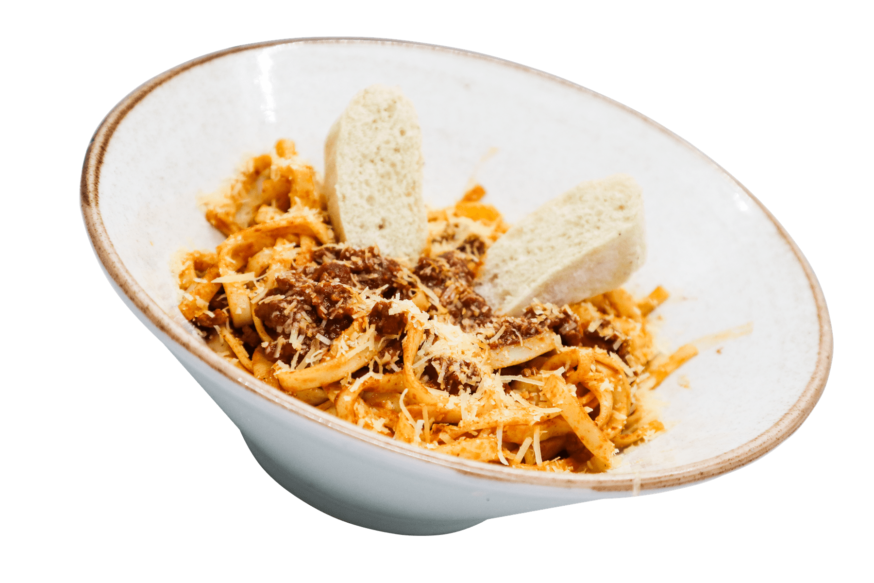 Espagueti con salsa boloñesa y queso parmesano.
